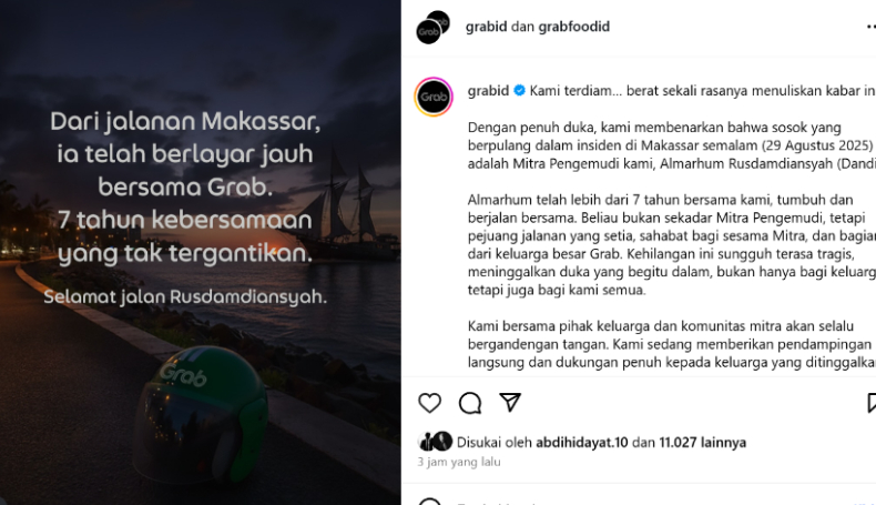 "Kami terdiam… berat sekali rasanya menuliskan kabar ini. Dengan penuh duka, kami membenarkan bahwa sosok yang berpulang dalam insiden di Makassar semalam (29 Agustus 2025) adalah Mitra Pengemudi kami, Almarhum Rusdamdiansyah (Dandi)," tulis @grabid