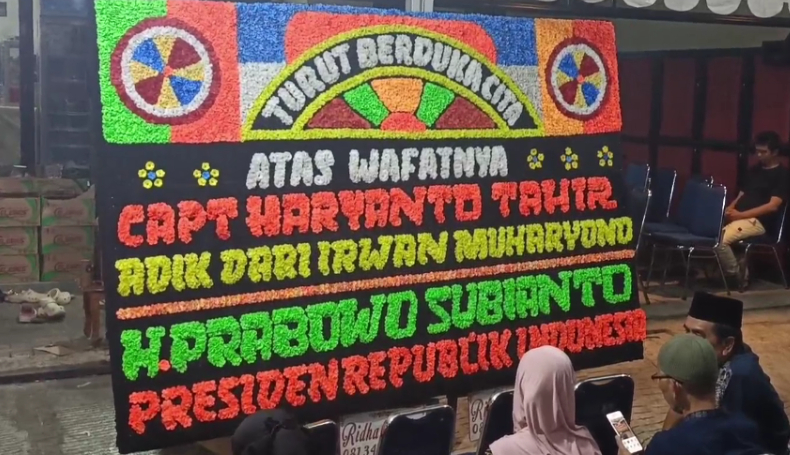Salah satu karangan bunga mencolok tersebut datang dari Presiden Prabowo Subianto, Ketua MPR Ahmad Muzani, hingga Menteri Luar Negeri Sugiono, sebagai bentuk penghormatan terakhir bagi almarhum.