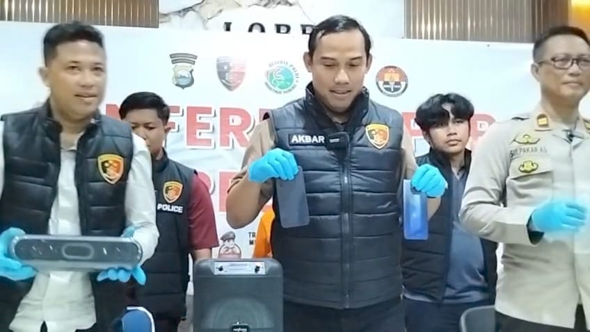 Dari tangan pelaku, polisi menyita sembilan unit handphone berbagai merek, satu set speaker aktif, tiga mikrofon, satu kalung emas sekitar tiga gram, uang tunai Rp 350.000, sepeda motor Yamaha X-Ride, serta barang elektronik lainnya.